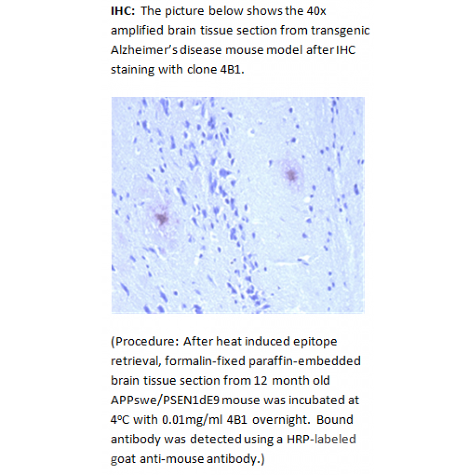 (Procedure: After heat induced epitope retrieval, formalin-fixed paraffin-embedded brain tissue section from 12 month old APPswe/PSEN1dE9 mouse was incubated at 4oC with 0.01mg/ml 4B1 overnight. Bound antibody was detected using a HRP-labeled goat anti-mouse antibody.)
