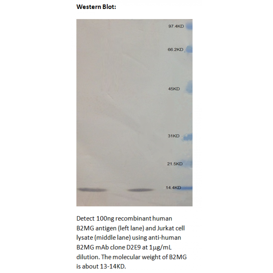 2. Western Blot: Detect 100ng recombinant human B2MG antigen (left lane) and Jurkat cell lysate (middle lane) using anti-human B2MG mAb clone D2E9 at 1mg/mL dilution. The molecular weight of B2MG is about 13-14KD.