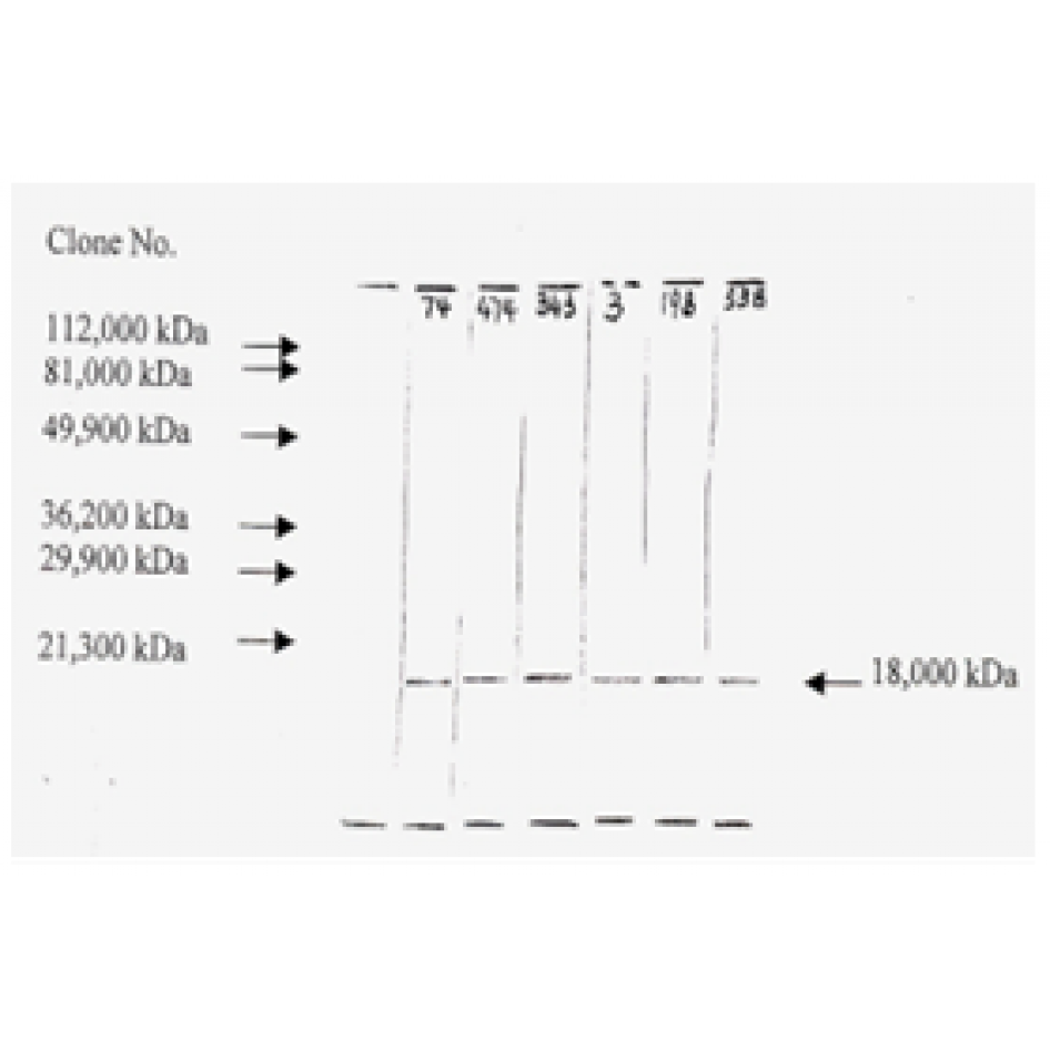 Figure (see image): Western blot analysis of recombinant human bFGF using anti-human bFGF monoclonal antibodies.   From left to right: MWM, clone F-74, F-474, F-343, F-3, F-198 and F-538.