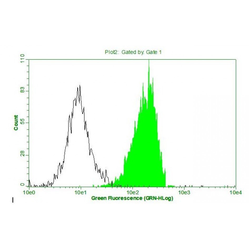 Fluorescence flow cytometry: Above (see image) is the histogram of Jurkat cells stained with 10mg/ml mouse anti-human CD11α monoclonal antibody.  Black line histogram represents Jurkat cells stained with isotype control, mouse anti-TB 38Kd antigen monoclonal antibody (MO-I40021D, B12F8).