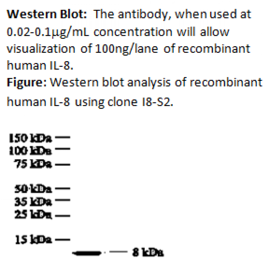Western Blot: The antibody, when used at 0.02-0.1mg/mL concentration will allow visualization of 100ng/lane of recombinant human IL-8.