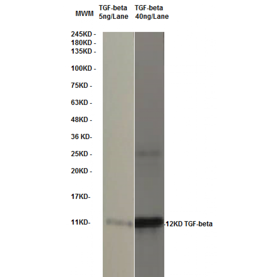Western Blotting:  This antibody, when used at concentration of 1-10ng/mL, will allow visualization of 100ng/lane of TGF-β.
