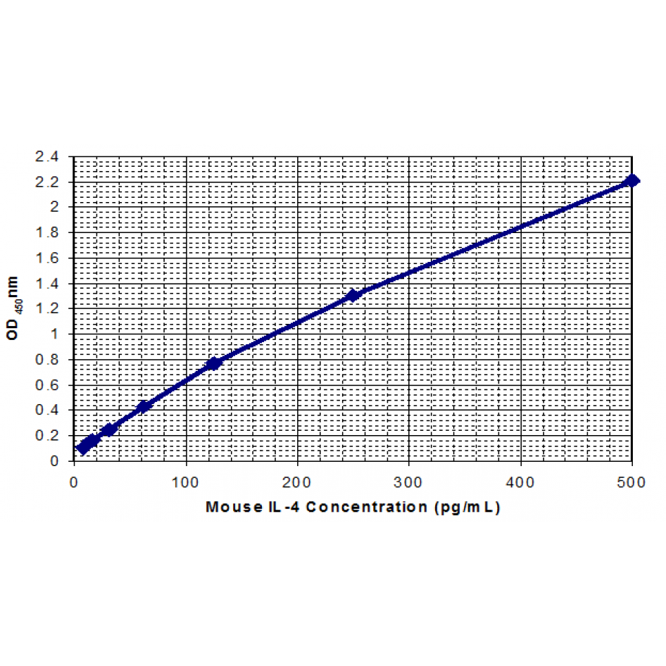 This mouse IL-4 ELISA is a 3.5-hour solid-phase immunoassay readily applicable to measure mouse IL-4 levels in serum, cell culture supernatant, and other biological fluids in the range of 7.8 to 500pg/mL.